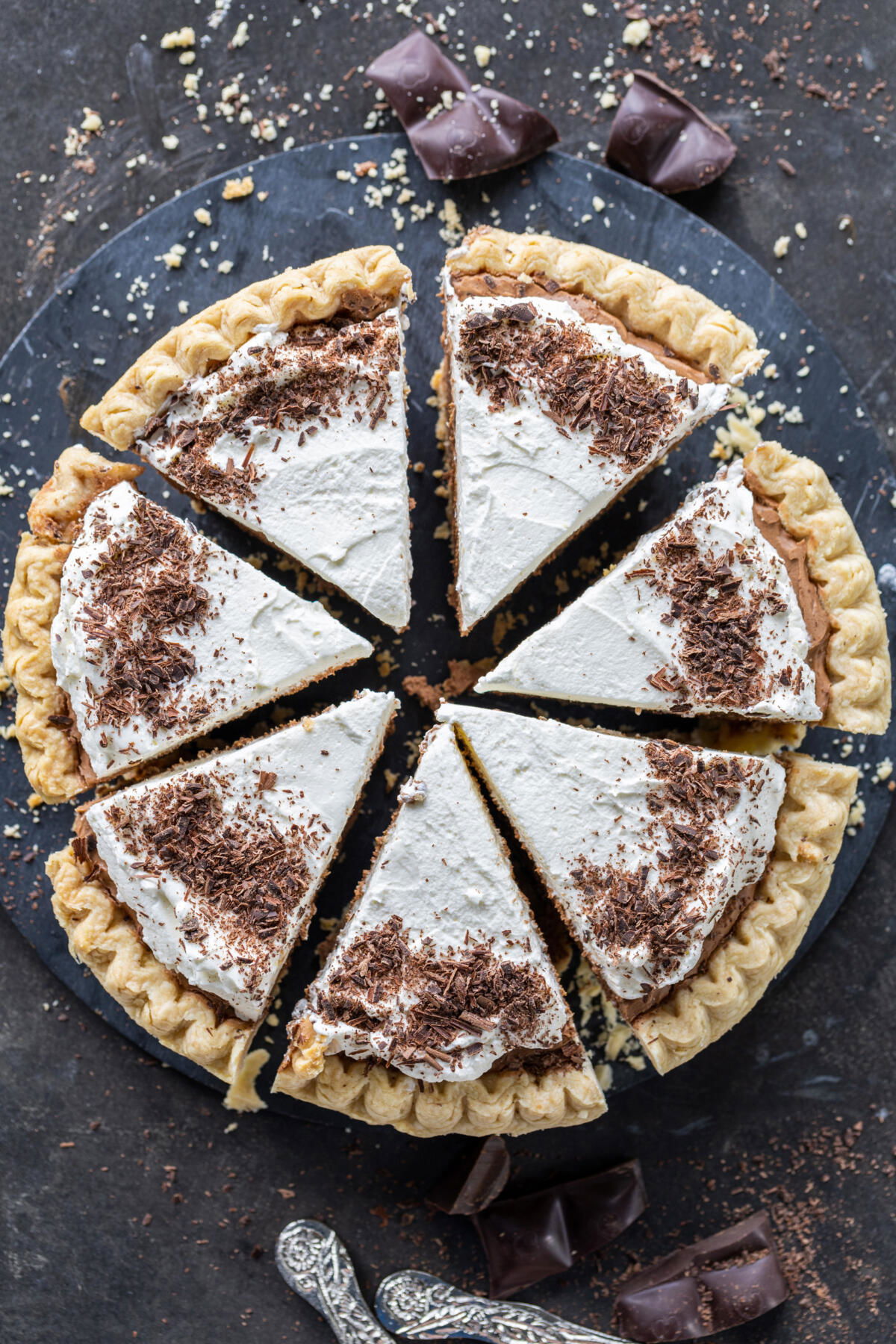 Une mousse au chocolat délicieusement lisse et une pâte à tarte croustillante composent cette décadente tarte au chocolat. Garnissez-la de crème fouettée et de copeaux de chocolat pour une indulgence ultime !