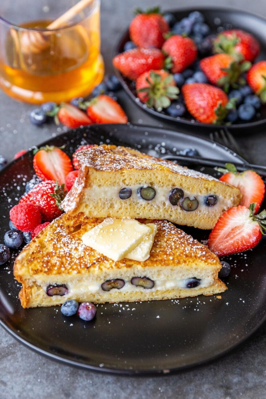Aller à la recette Ce pain perdu farci est d'une couleur dorée, croustillant et rempli de fromage à la crème et de myrtilles. Préparez-vous à vous lever plus tôt que jamais ! Qu'est-ce que le pain perdu farci ? Le pain perdu farci est en fait un sandwich au pain perdu. Il…